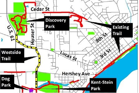 The Westside Trail has an estimated price tag of $795,758. This approximately 1.75 mile trail would run from the Kent Stein Park trailhead to Discovery Park and complete a 15-mile trail network through the City of Muscatine connecting all of the Muscatine area major recreational amenities.